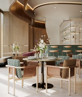 Le design mêle inspirations Art Déco et modernité raffinée, exprimant la force, la précision et la transparence à travers un jeu subtil de pierre, de métal et de verre.