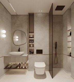 Salles de bains en porcelaine effet pierre avec robinetterie finition or brossé